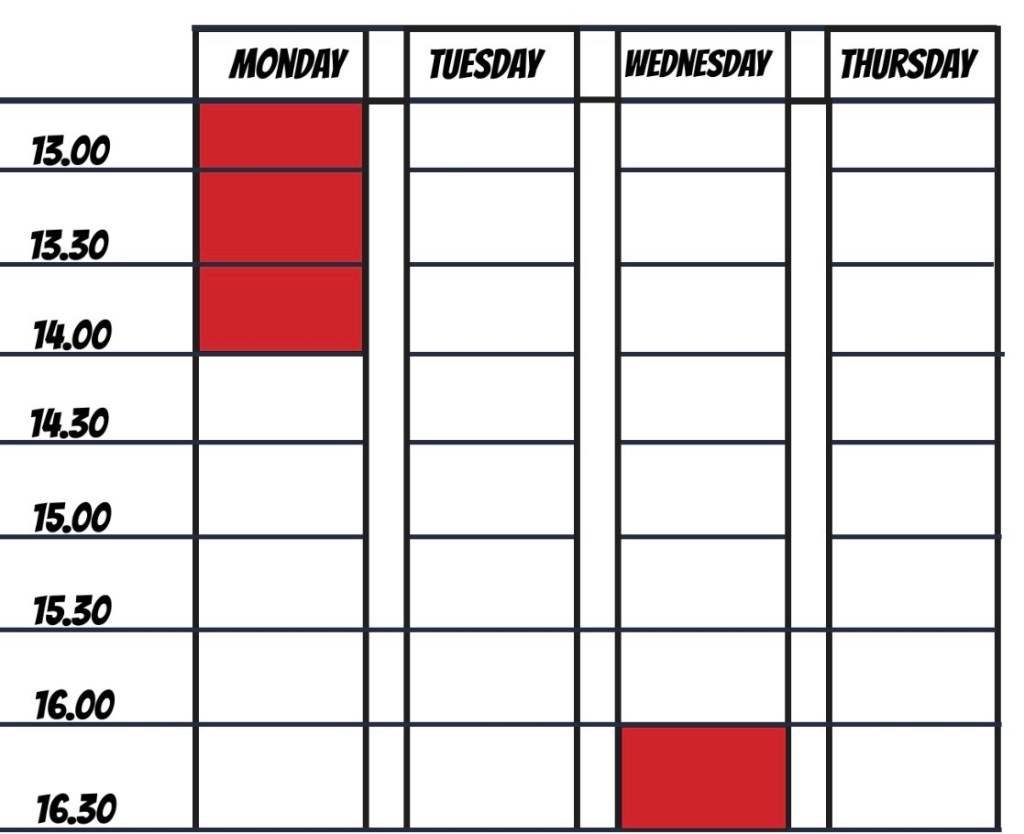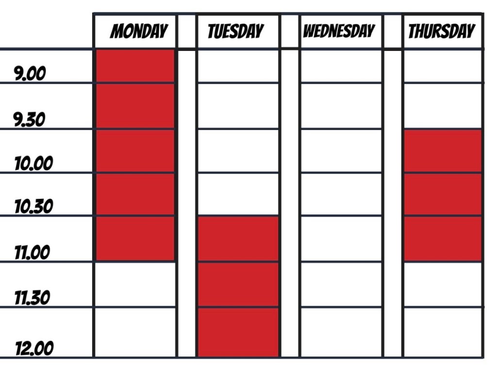 Timetable Mornings White= Available Red= Booked Afternoon If there is a time available that fits your schedule, book a trial lesson for free. chiricorp@gmail.com
